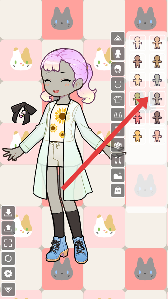 1、進入游戲,首先要點右側(cè)膚色分類,參與者選擇自己喜歡的膚色,確定角色的基礎(chǔ)的外觀。