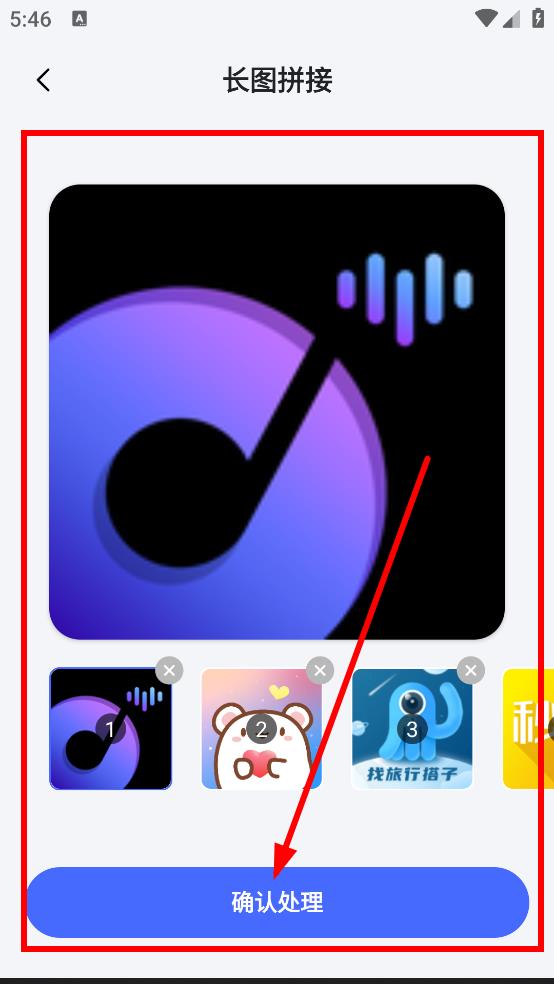 2、在長圖拼接頁面,選擇要拼接的圖片后,點(diǎn)擊確認(rèn)處理,進(jìn)行長圖拼接操作。