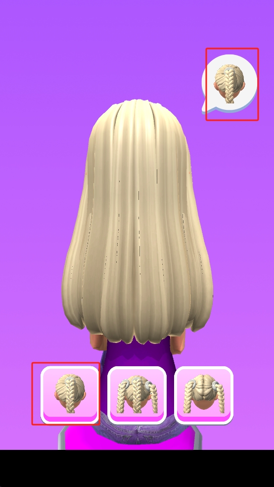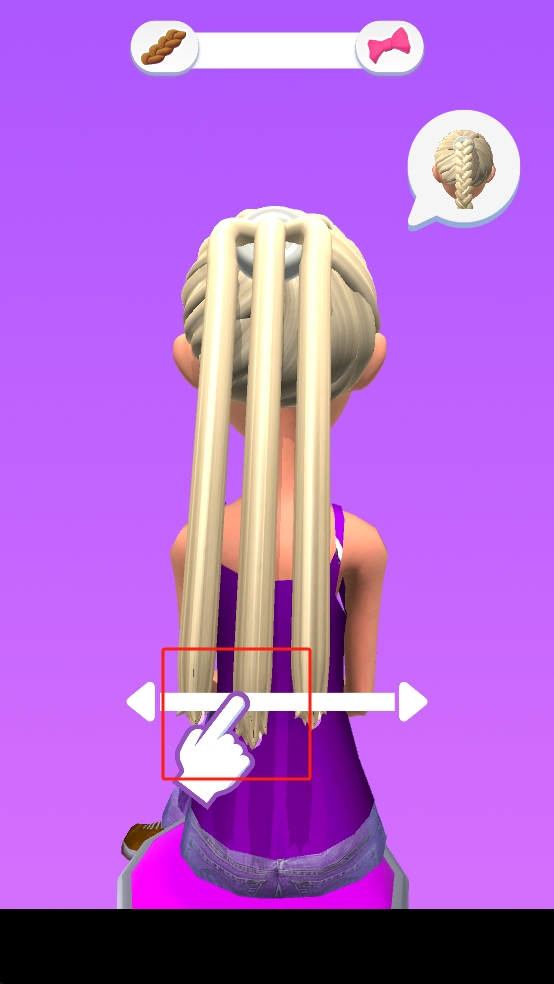 2、發(fā)型更換后,依據(jù)提示,用手指拖動(dòng)白色橫條,調(diào)整發(fā)絲分段,配合頂部工具,逐步編織出目標(biāo)麻花辮造型。