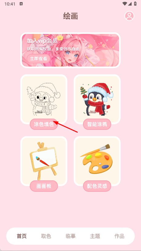1、打開兒童涂色涂鴉,在繪畫頁,點(diǎn)擊涂色填色。