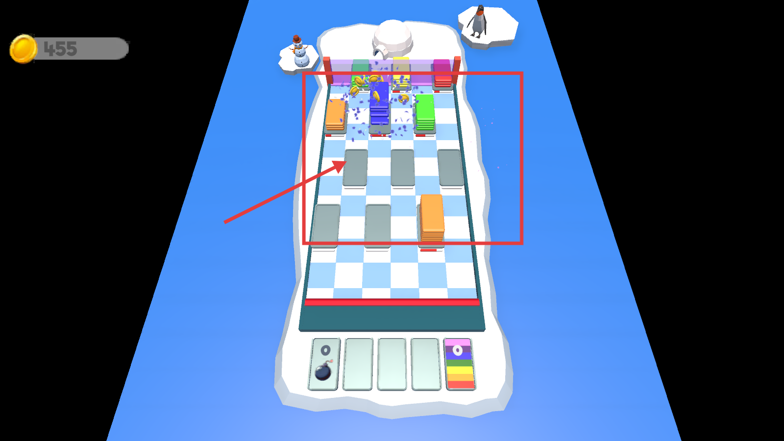 1、開局聚焦【彩色方塊】分布,依托棋盤空格規(guī)劃堆疊,結(jié)合左上角【455】金幣,優(yōu)先鞏固核心區(qū)域。