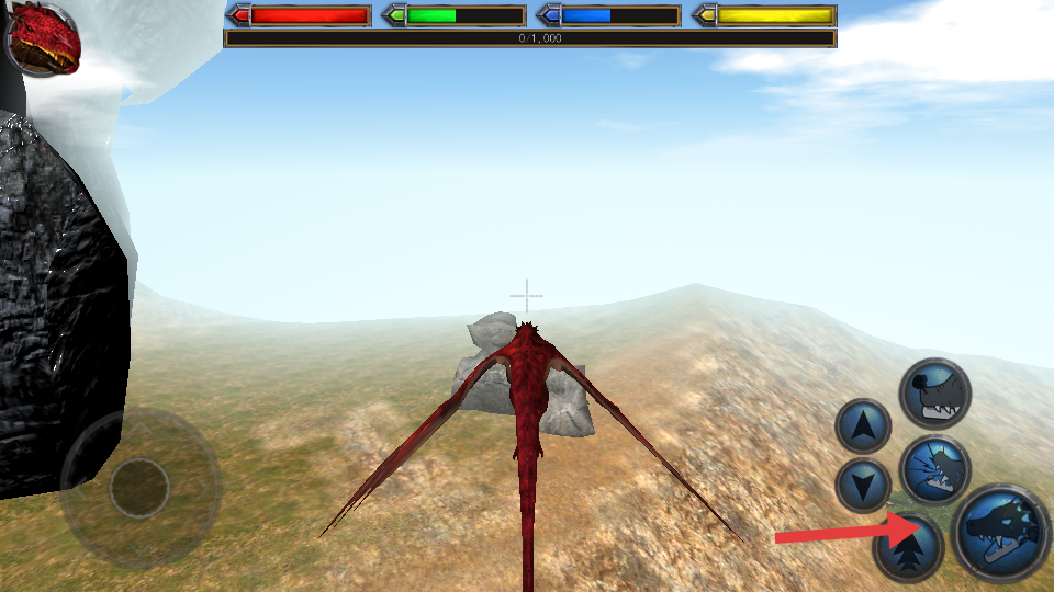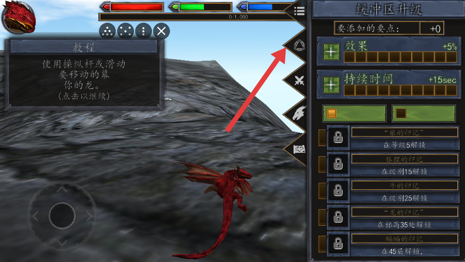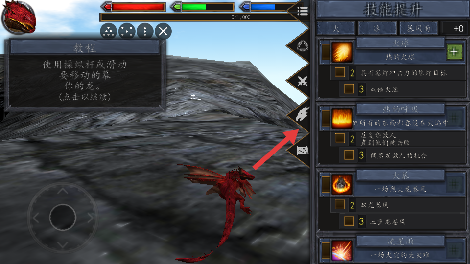 1、進(jìn)入游戲后選擇初始巨龍種類,通過虛擬搖桿控制巨龍移動(dòng)與飛行,點(diǎn)擊攻擊按鈕釋放基礎(chǔ)吐息技能,熟悉巨龍的基礎(chǔ)操作方式。