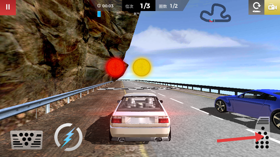 2、駕駛途中通過虛擬方向盤控制方向,點(diǎn)擊剎車鍵減速過彎,收集賽道上的加速道具,利用道具在關(guān)鍵路段實(shí)現(xiàn)快速?zèng)_刺。