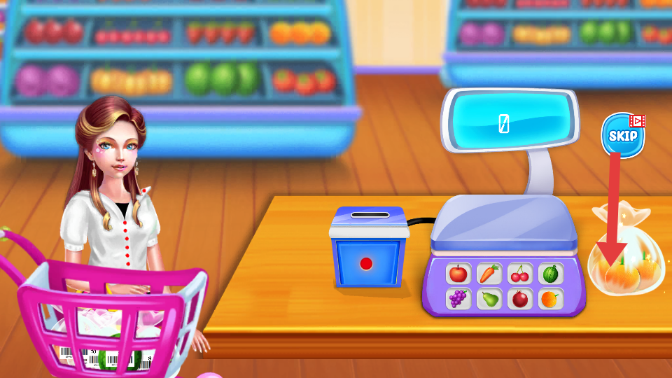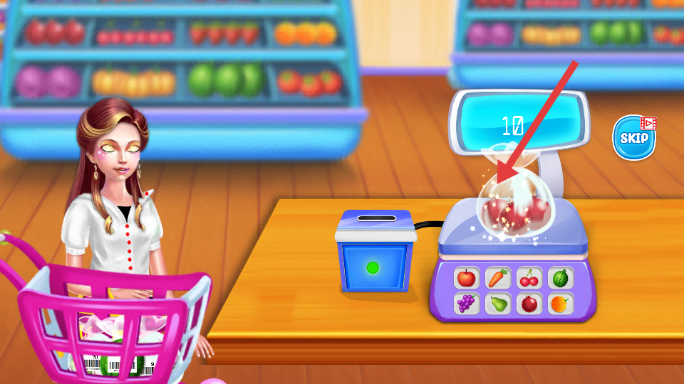 3、錄入完所有商品,等收銀機(jī)數(shù)字歸0,完成結(jié)賬,如果想快速通關(guān),點(diǎn)SKIP跳過稱重的流程。