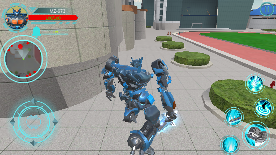 2、戰(zhàn)斗時鎖定邪惡機甲目標,切換不同武器應對敵人弱點,當敵人逃竄時,點擊變身按鈕激活機甲變身形態(tài),提升速度追擊對手。