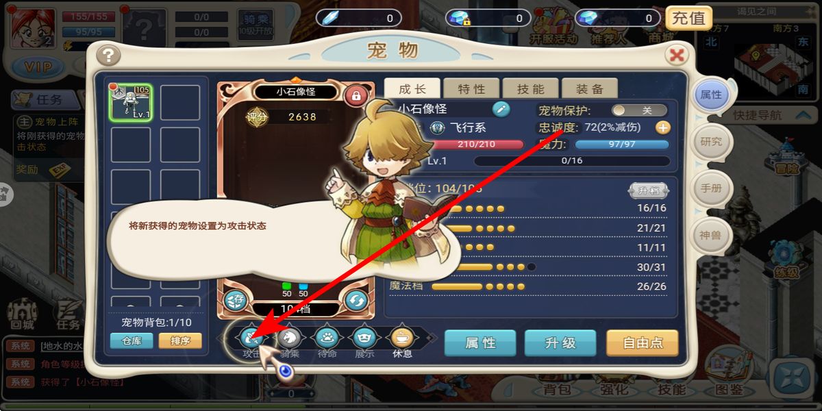 2、寵物狀態(tài)調(diào)整,進入寵物界面,新獲寵物默認非攻擊態(tài),點擊攻擊按鈕切換,提升戰(zhàn)斗中寵物主動輸出的優(yōu)先級與參與度。