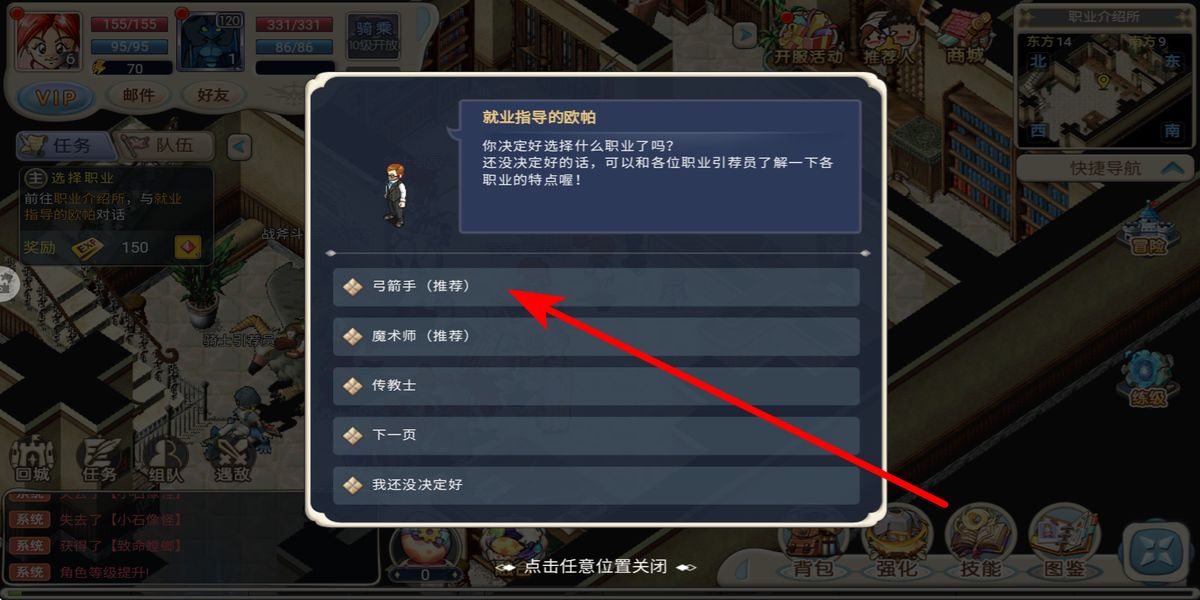 3、職業(yè)選擇邏輯,前往職業(yè)介紹所,與歐帕對話,可選弓箭手輸出、魔術(shù)師魔法等推薦職業(yè),結(jié)合戰(zhàn)斗定位與自身偏好抉擇。