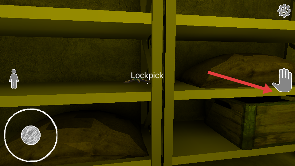 1、用搖桿移動(dòng),先探索場(chǎng)景,在黃色的架子找到Lockpick開(kāi)鎖器,點(diǎn)擊手型的按鈕進(jìn)行拾取。