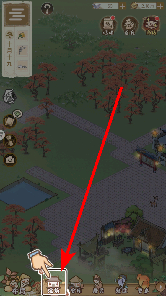 1、建筑入口觸發(fā),點(diǎn)擊主界面底部建筑圖標(biāo),進(jìn)入建造頁(yè)面,左側(cè)陳列住宅、植物等分類,依據(jù)村落發(fā)展需求,選定住宅分類開(kāi)啟建造流程。