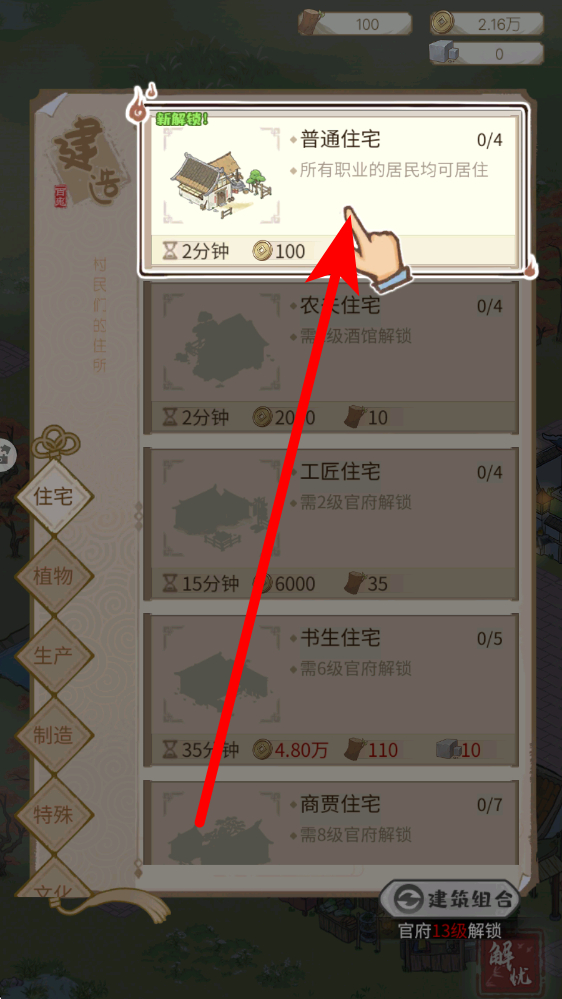 2、普通住宅搭建,在住宅列表中,選擇普通住宅消耗100金幣、耗時(shí)2分鐘,確認(rèn)建造后,等待施工進(jìn)度條走完,解鎖居民居住載體。
