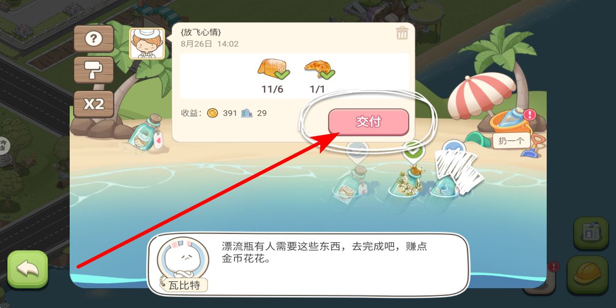 3、交付訂單盈利,查看漂流瓶等訂單需求,湊齊面包、糕點等物資,點擊交付獲取金幣與建材,積累資源用于城市升級及裝飾拓展。