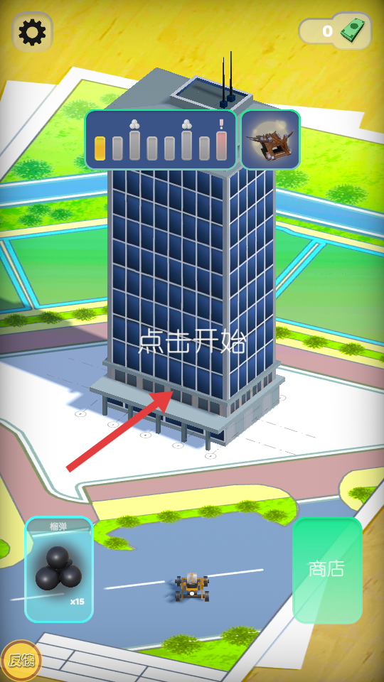 1、進(jìn)入游戲后在場(chǎng)景選擇界面挑選目標(biāo)城市區(qū)域,點(diǎn)擊解鎖初始爆破道具,確定首個(gè)需要摧毀的建筑物。