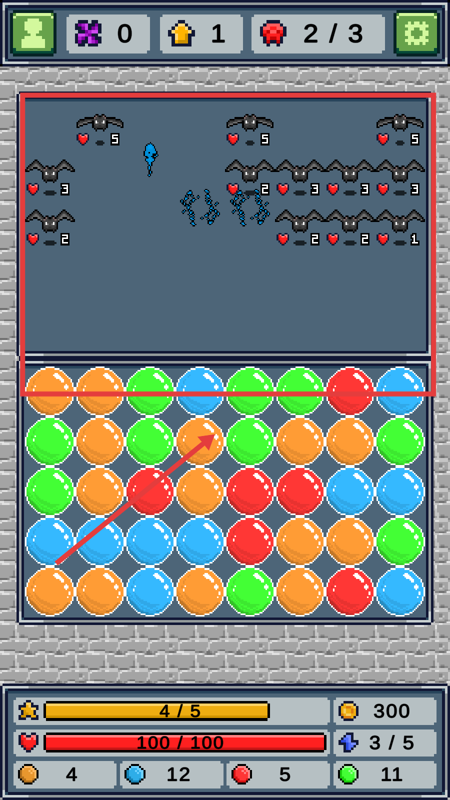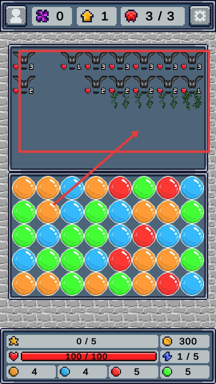 3、體力回合制戰(zhàn)斗節(jié)奏:引入體力限制與回合切換機制,每消除一次元素球會消耗1點體力,體力槽空則自動進入敵方回合,敵人會向前移動一格,當敵人越過屏幕中間的防線時。