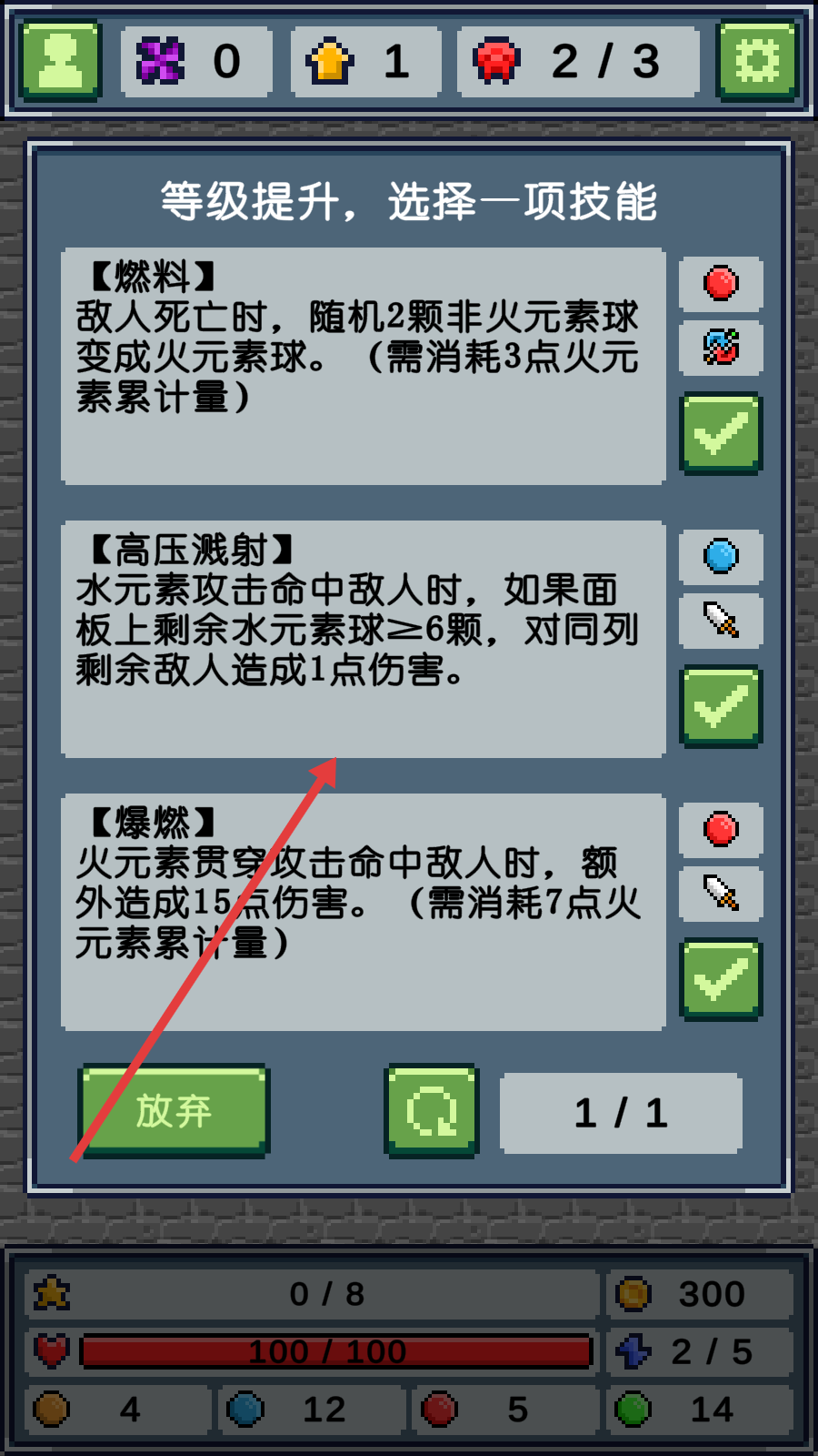 2、闖關中期,積累足夠經(jīng)驗升至2級,在“范圍消除”“傷害加成”“體力恢復”三個技能中選其一,用新技能輔助消除更多元素球。