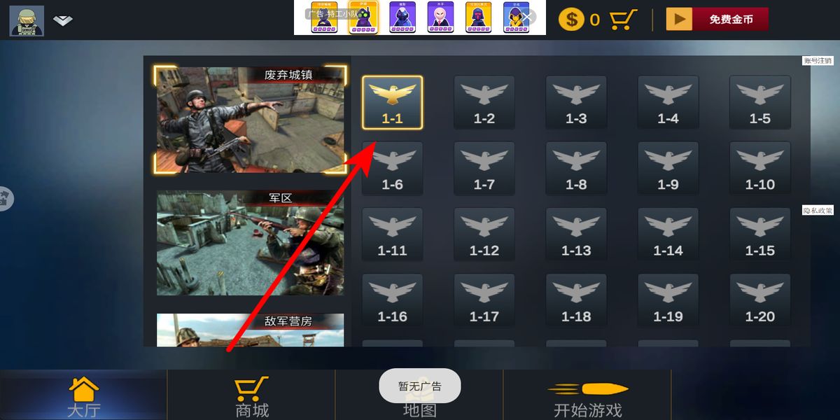 2、地圖界面在主界面點擊地圖,跳轉(zhuǎn)至關(guān)卡選擇頁面,識別關(guān)卡在廢棄城鎮(zhèn),可看到不同場景分類廢棄城鎮(zhèn)、軍區(qū)等,找到廢棄城鎮(zhèn)區(qū)域。