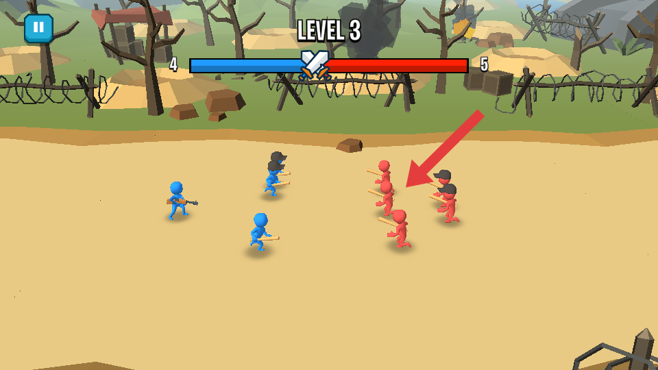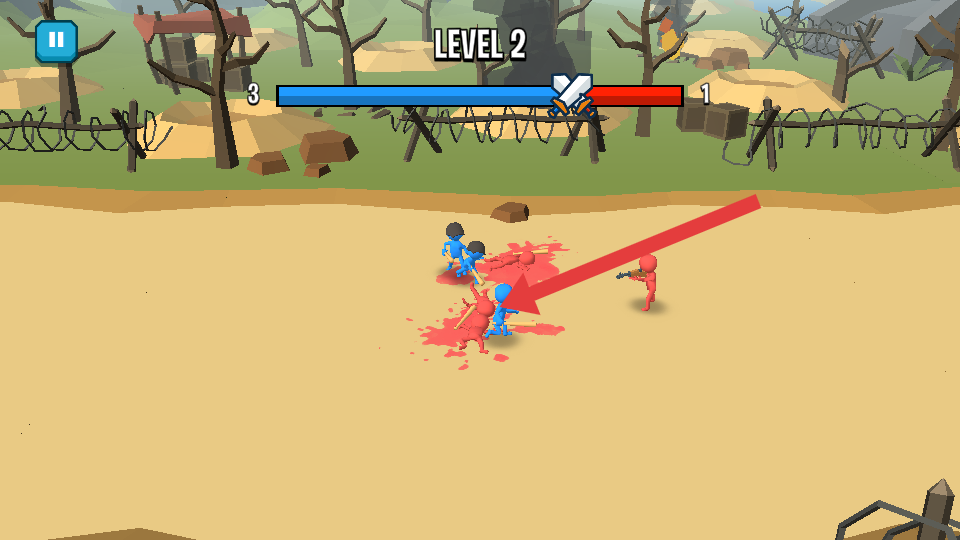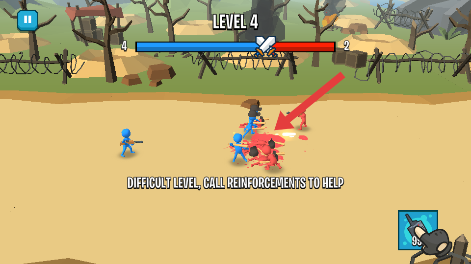 1、進(jìn)入LEVEL2,藍(lán)色小人部隊(duì)與紅色敵人交鋒,優(yōu)先集火箭頭指向的敵方單位,快速削減其戰(zhàn)力,為勝利奠基。