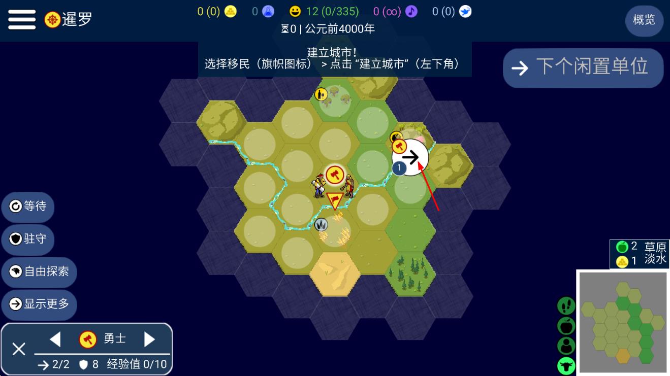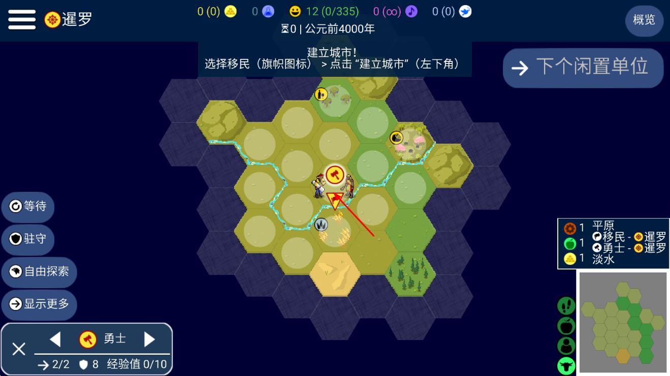 1、按指引選【移民-旗幟圖標(biāo)】,點(diǎn)擊左下角【建立城市】,開啟公元前4000年建城流程。