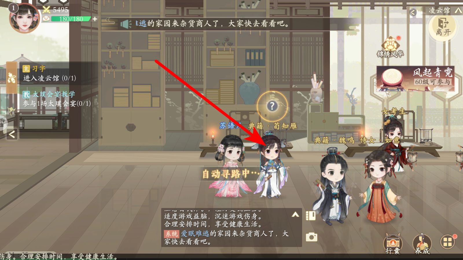 3、進入游戲場景,跟隨清晰任務指引,自動尋路功能會智能引導前往目標NPC處,參與習字太璞會宴教學等初期任務,快速熟悉玩法與操作邏輯。