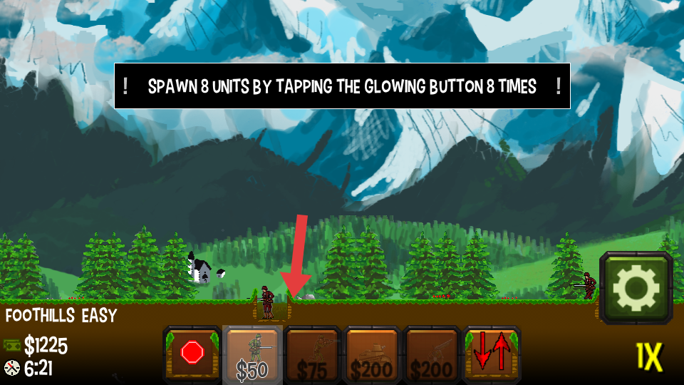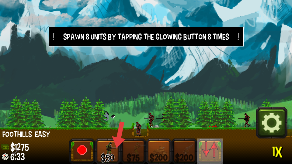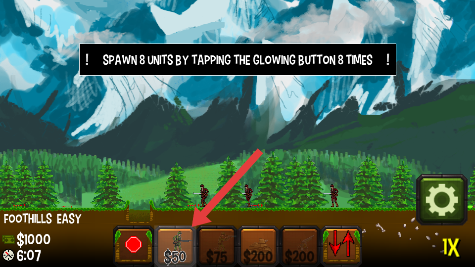 1、進入關卡,看到提示SPAWN8UNITS BY TAPPING THE GLOWING BUTTON8TIMES,找到下方$50對應的發(fā)光兵種的按鈕。