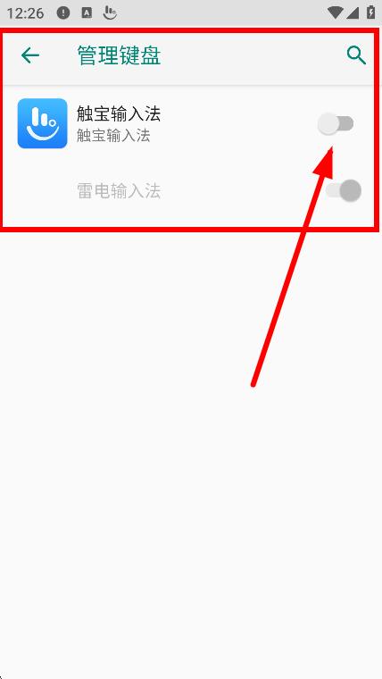 2、在管理鍵盤頁面,打開觸寶輸入法的開關。