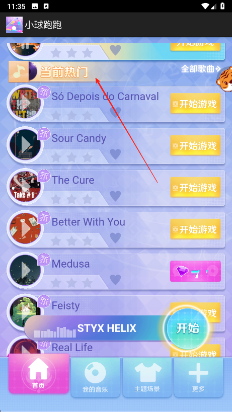 2、在歌曲選擇界面,查看當(dāng)前熱門歌曲列表,找到想玩的歌曲,點擊右側(cè)開始游戲按鈕。