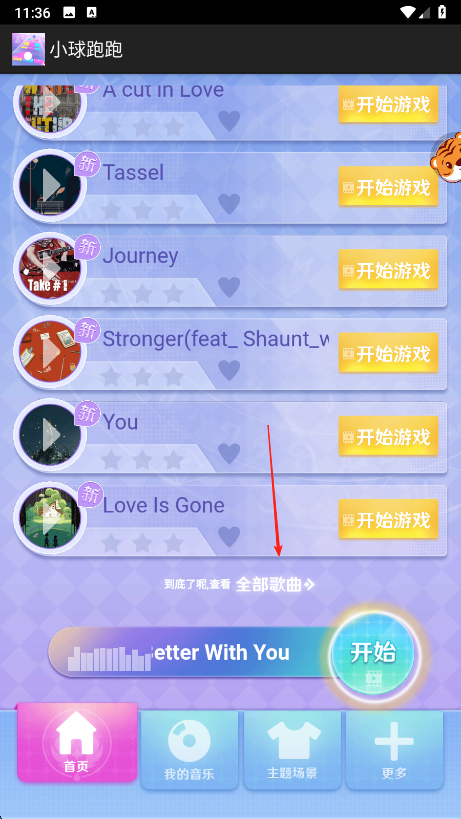 3、若列表沒有心儀歌曲,滑動頁面到最下方,點擊全部歌曲,在完整曲庫中選擇歌曲,點擊開始游戲即可。