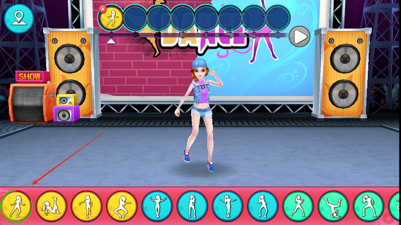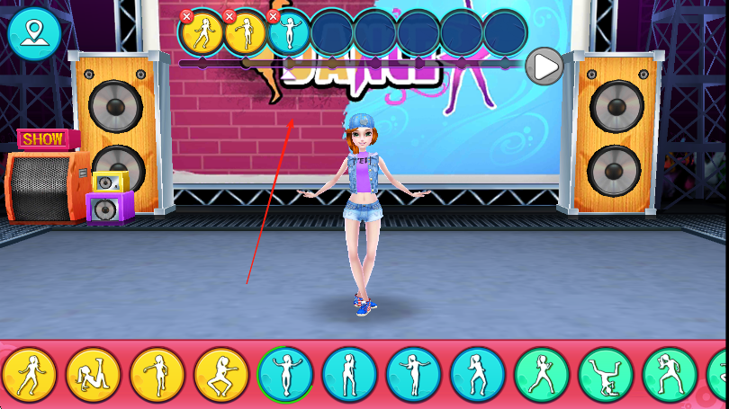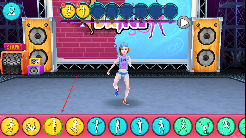 2、下方出現(xiàn)對應舞蹈動作按鈕時,按上方圓圈內(nèi)動作順序,點擊相應按鈕,讓角色做出正確舞蹈動作。