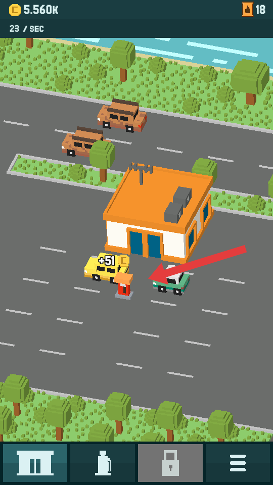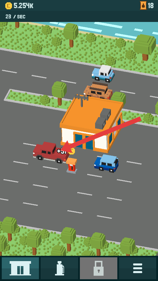 1、觀察道路上來往車輛紅車,點(diǎn)擊車輛并按紅色箭頭指引,將其拖動到加油站加油位,完成加油操作。