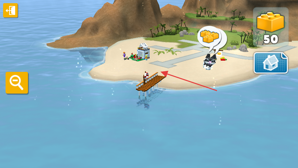 3、回到島嶼場(chǎng)景,利用剩余樂高塊50塊,跟隨紅箭頭指引,前往新區(qū)域探索,可發(fā)現(xiàn)隱藏搭建點(diǎn),持續(xù)拓展島嶼樂高世界。