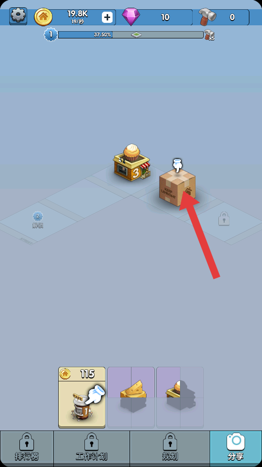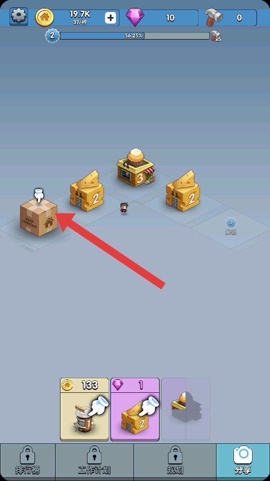 2、點(diǎn)擊帶感嘆號的建筑如箱子,升級現(xiàn)有店鋪如蛋糕店到3級,提升收益效率,同步的推進(jìn)等級的進(jìn)度。