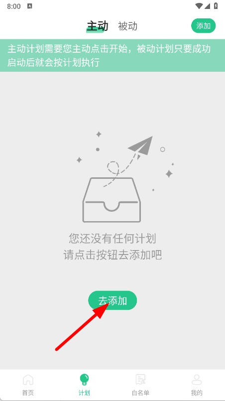 2、在主動(dòng)計(jì)劃頁(yè),點(diǎn)擊去添加,進(jìn)入添加主動(dòng)計(jì)劃界面。