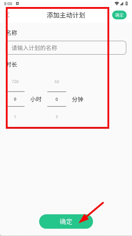 3、填寫(xiě)計(jì)劃名稱、時(shí)長(zhǎng),點(diǎn)擊確定,完成主動(dòng)計(jì)劃添加。
