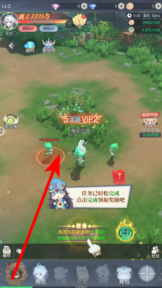 1、新手開始游戲在場景中,根據(jù)任務(wù)消滅對應(yīng)波次怪物綠色小怪,完成消滅當(dāng)前波怪物任務(wù),推動冒險進(jìn)程,為后續(xù)挑戰(zhàn)與獎勵獲取奠基。