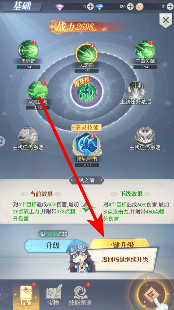 3、繼續(xù)提升進(jìn)入技能界面,選擇需升級技能風(fēng)之箭,點擊一鍵升級,消耗資源提升技能等級,增強(qiáng)技能傷害與附加效果,助力戰(zhàn)斗輸出。
