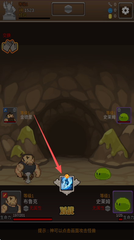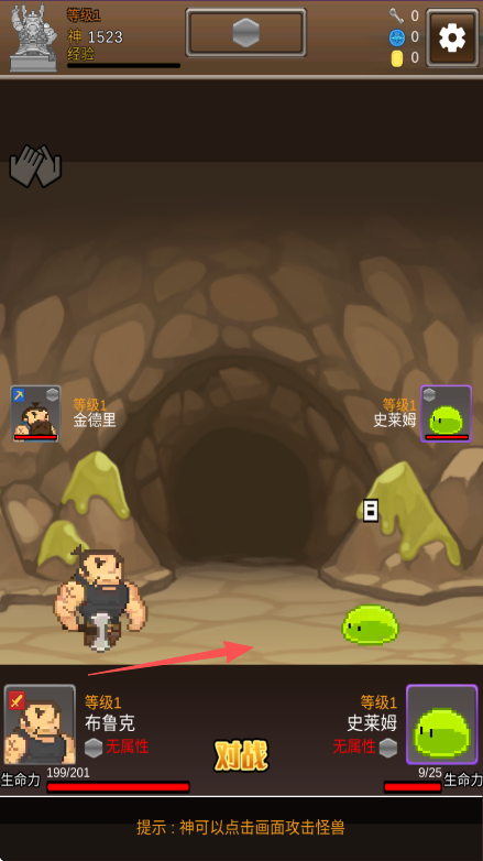 3、戰(zhàn)斗中,點擊畫面可讓神協(xié)助攻擊怪物,擊敗怪物后收集掉落物品,持續(xù)探索洞穴完成挖寶任務(wù),提升等級解鎖更多隊員和功能。