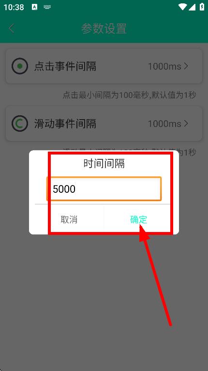 3、在時間間隔設(shè)置框中,輸入時間值后,點(diǎn)擊確定完成點(diǎn)擊事件間隔設(shè)置。
