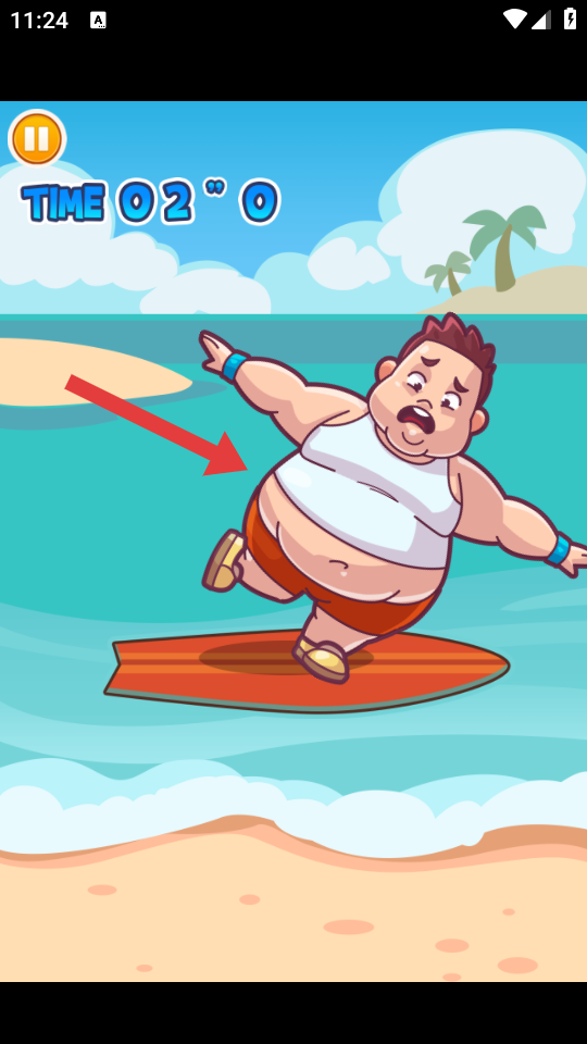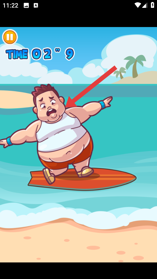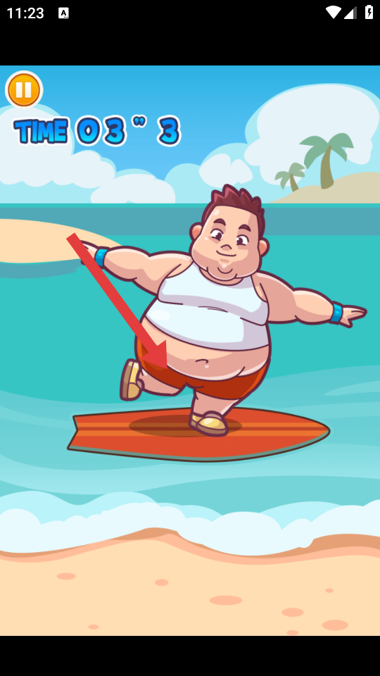 2、箭頭指向腿部,立刻點擊對應(yīng)腿,通過精準(zhǔn)操作,讓肥仔保持站立,避免因失衡掉落海浪,延長運動。