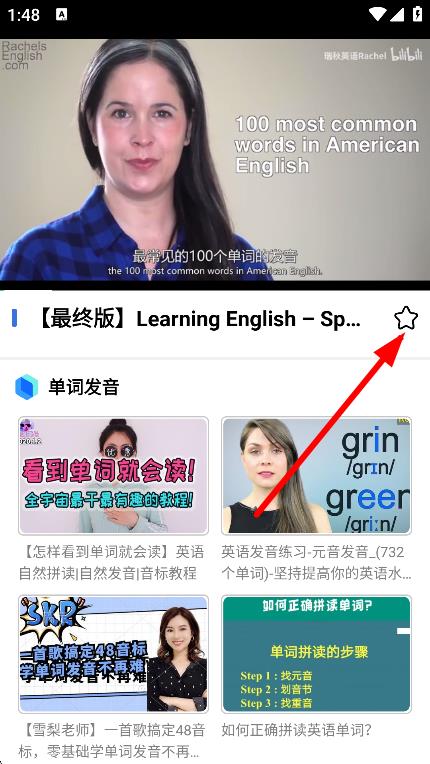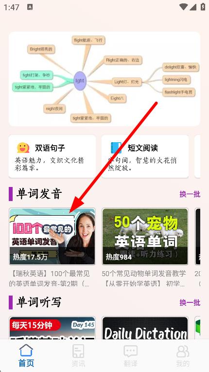 1、在首頁(yè)單詞發(fā)音板塊,點(diǎn)擊最常見的英語單詞發(fā)音視頻,進(jìn)入播放頁(yè)面。