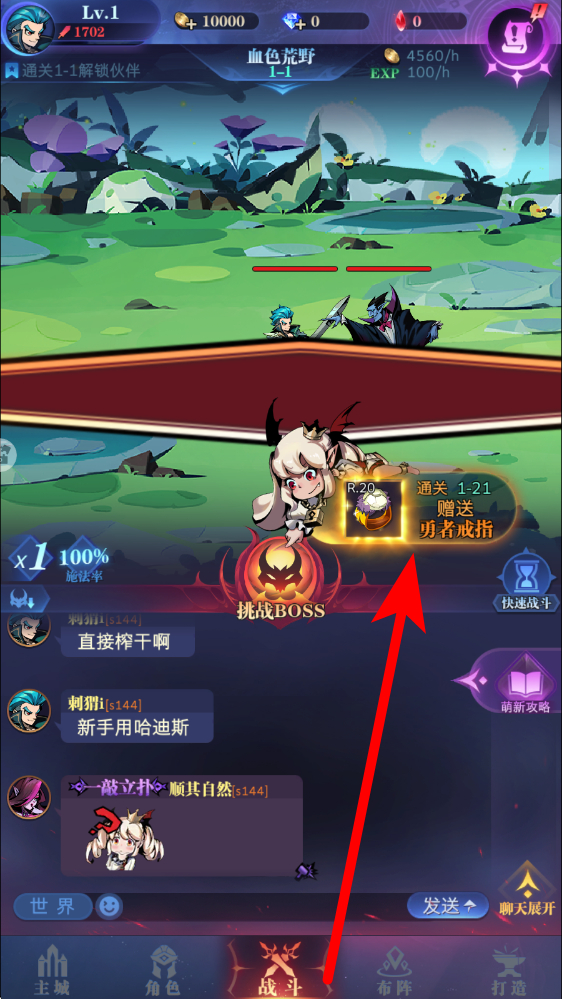 2、新手進入戰(zhàn)斗場景后,推進關卡血色荒野1,達成通關條件通關21關可獲取獎勵勇者戒指,提升角色戰(zhàn)力,持續(xù)拓展冒險進度。