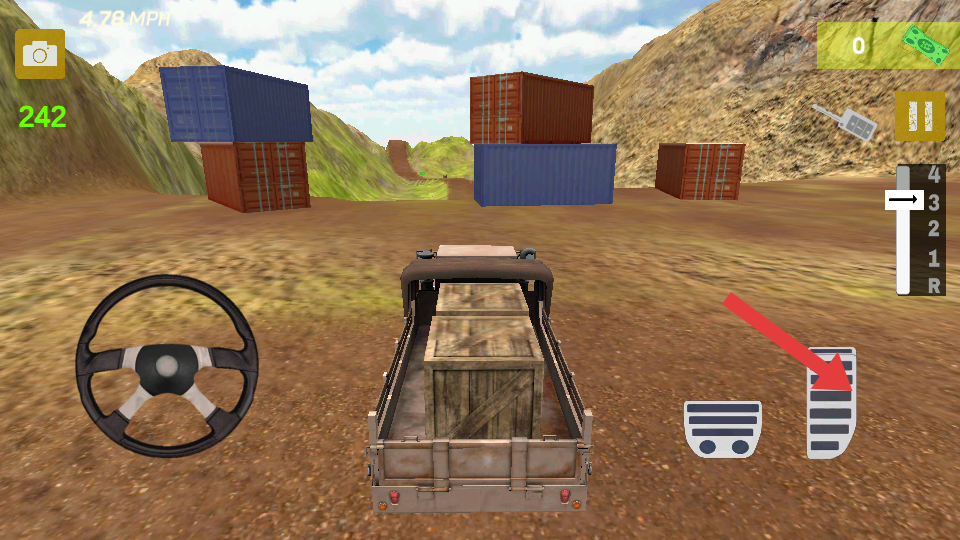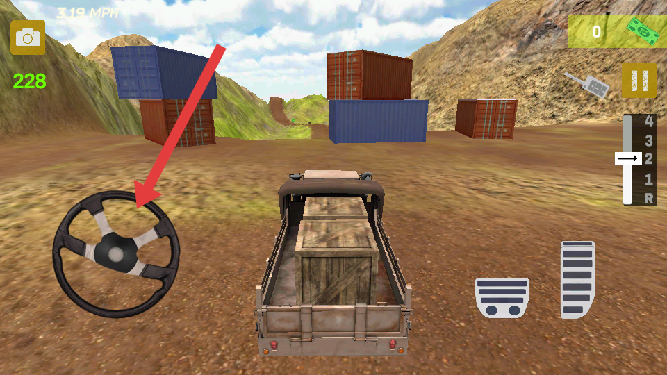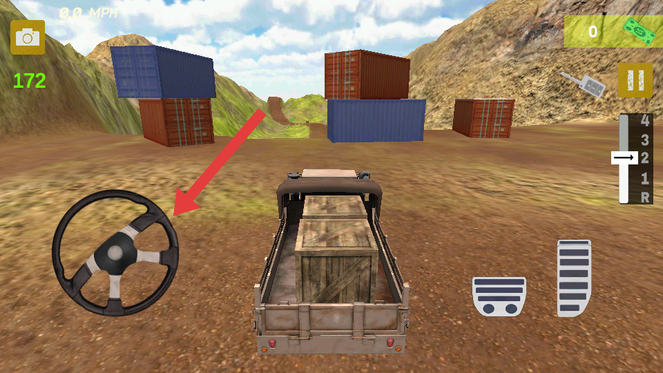 1、進(jìn)入越野卡車模擬駕駛,熟悉操控:左側(cè)方向盤控制方向,起步時輕踩加速,觀察速度,調(diào)整方向,避開集裝箱障礙。