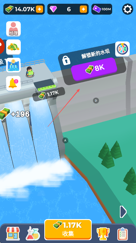 1、進(jìn)入游戲查看屏幕上方顯示的金錢14.07K、鉆石6等資源數(shù)量,看到解鎖新水壩需8K金錢。