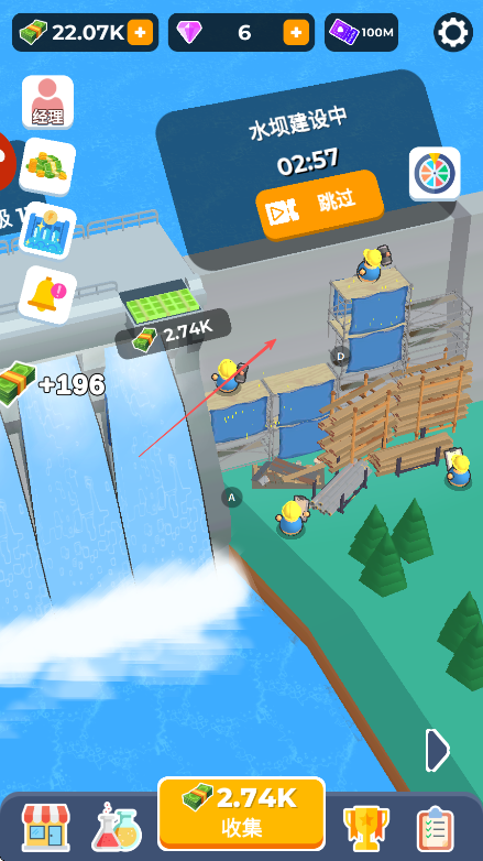2、點(diǎn)擊下方收集按鈕獲取金錢,積累到足夠數(shù)量后,點(diǎn)擊解鎖新水壩按鈕開始建設(shè),建設(shè)時會顯示倒計時。