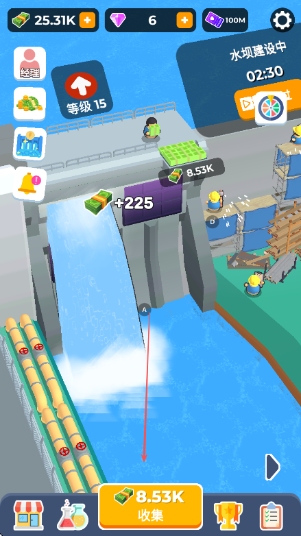 3、持續(xù)收集金錢,提升等級如等級15,加速水壩建設(shè)進(jìn)度,還能通過相關(guān)功能按鈕管理和升級水壩設(shè)施。