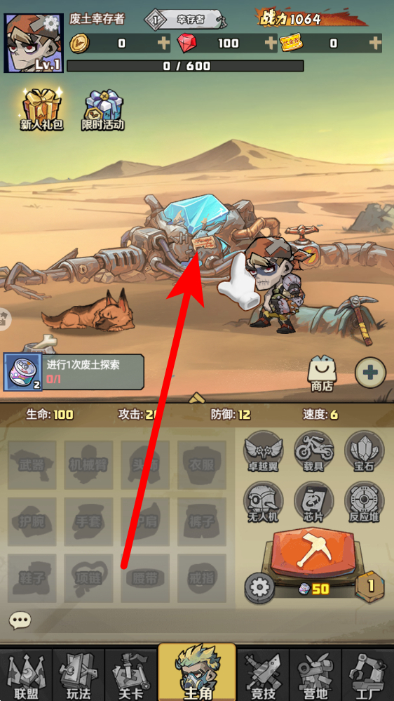 1、進(jìn)入游戲后,點(diǎn)擊場景中的探索目標(biāo)廢土機(jī)械殘骸,觸發(fā)探索流程,完成進(jìn)行1次廢土探索任務(wù),獲取資源與裝備,推進(jìn)廢土冒險(xiǎn)進(jìn)程。