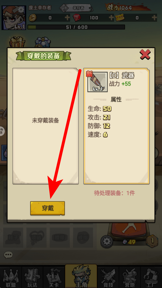 2、在裝備界面,選中獲取的裝備D級(jí)武器,點(diǎn)擊穿戴按鈕,將裝備穿在角色身上,提升生命、攻擊等屬性,增強(qiáng)角色戰(zhàn)力,應(yīng)對(duì)后續(xù)挑戰(zhàn)。