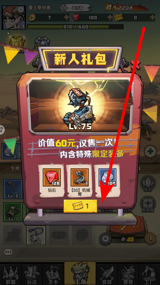 3、留意新人禮包界面,若有購買需求,點(diǎn)擊1元購買按鈕含特殊限定裝備的禮包,獲取禮包內(nèi)的鉆石、機(jī)械臂等資源,助力前期成長。