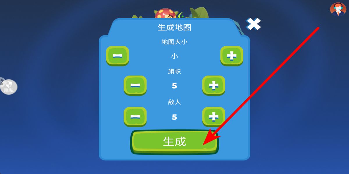 2、在隨機生成地圖界面,設(shè)置地圖大小、旗幟數(shù)量、敵人數(shù)量等參數(shù),確認(rèn)后點擊生成,創(chuàng)建專屬冒險地圖,準(zhǔn)備冒險探索。