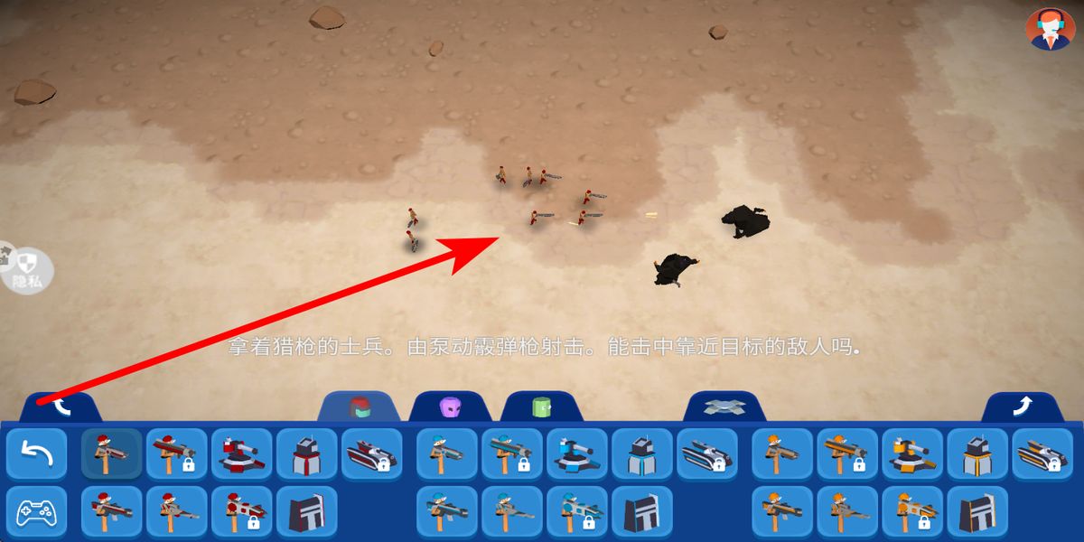 3、進入生成好的地圖,從下方選擇士兵載具建筑等單位布置,指揮其移動、攻擊敵人,利用不同單位特性,推進戰(zhàn)斗,熟悉玩法內(nèi)容。