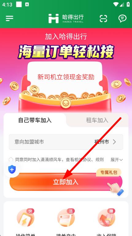 1、在哈得出行司機加入頁面,選好意向加盟城市等,點擊立即加入,進入上傳證件頁面。