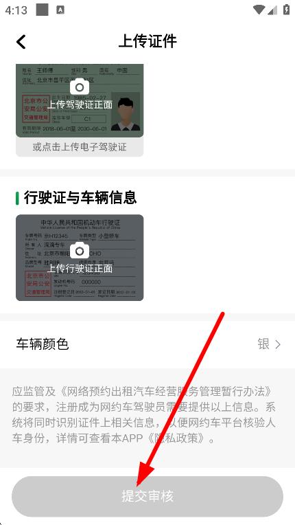 2、在上傳證件頁面,上傳駕駛證、行駛證等證件后,點擊提交審核。
